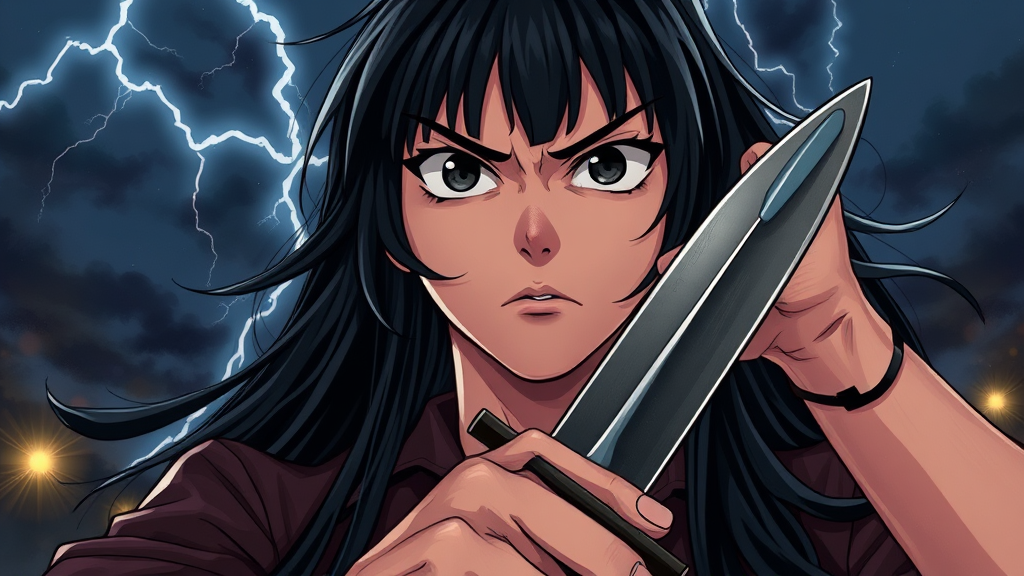 An intensely detailed digital illustration, high resolution, masterpiece, featuring a character with black hair and long flowing locks, styled with sharp bangs, looking directly at the viewer. The composition is a classic cowboy shot, capturing their upper body. This character possesses piercing black eyes and wields a short sword, exuding a grumpy and defiant demeanor, glaring upward. The perspective is from an elevated angle, showcasing a front view. Set against a nocturnal backdrop, the scene is bathed in dark ambient lighting, reminiscent of Wednesday Addams' gothic style. Occasional flashes of lightning illuminate the night, adding dramatic effect to the moody atmosphere.