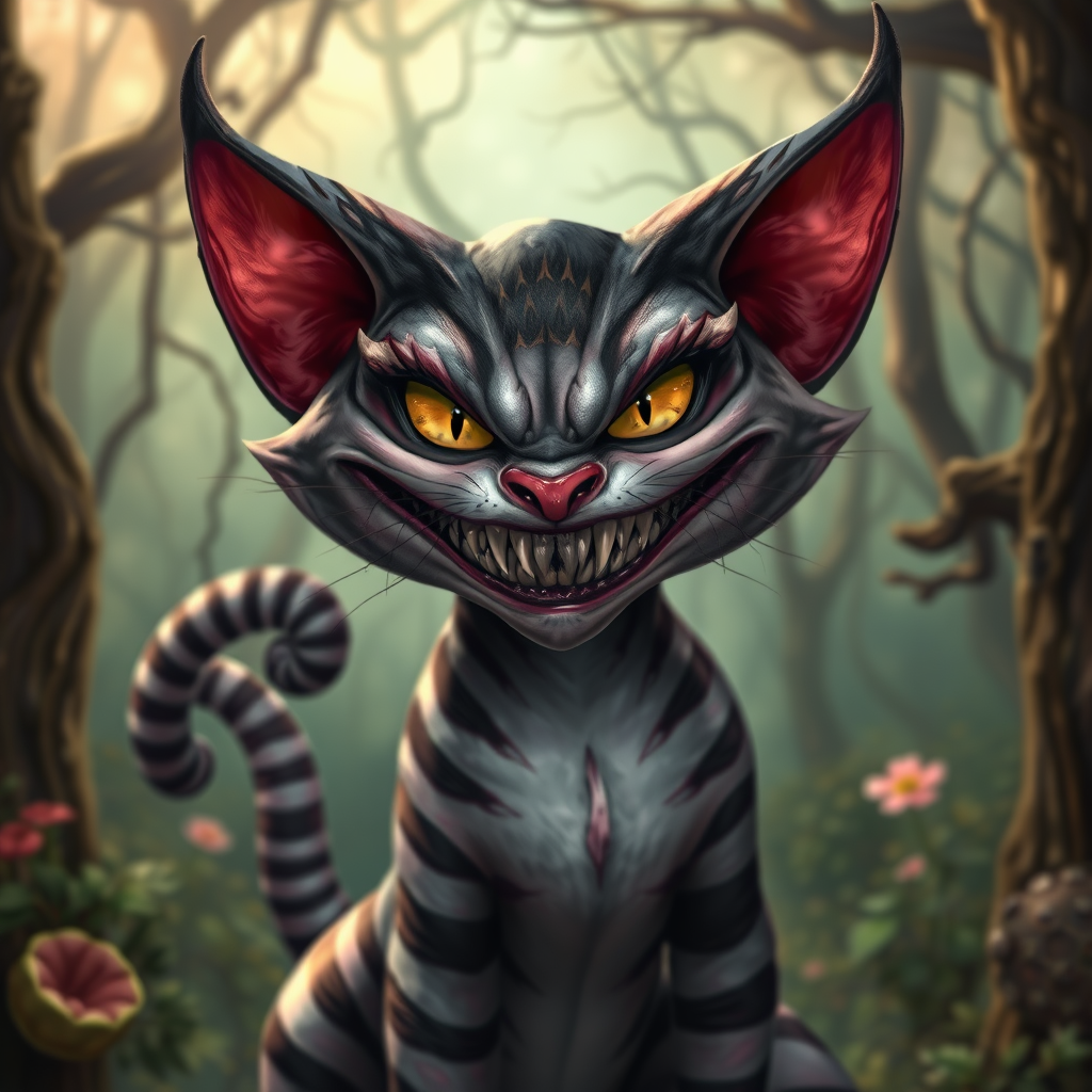 An interpretation of a fractal unholy Cheshire Cat in the Alice in Wonderland forest, set against a mystical, otherworldly background. The cat exhibits an eerie yet captivating expression, featuring an evil, mischievous grin. As a villain portraiture, it combines the essence of fractalcore with a dynamic pose, showcasing a fit, thick build. This gorgeous yet unnerving Cheshire is rendered in a realistic and hyper-detailed style, blending kawaii elements with the artfulness of ZBrush and hyper-realistic oil painting. The piece features contoured shading that emphasizes the cat's silhouette amidst the enchanted landscape.