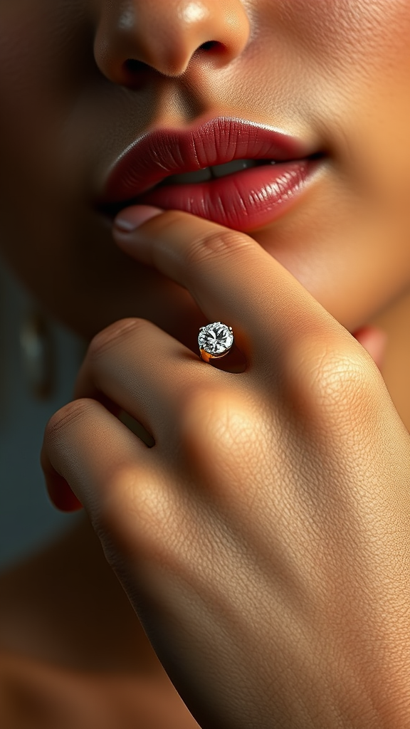 An intimate detail shot of a stunning, minimalist ring, seamlessly merging gold and diamond, elegantly resting on the finger of a seasoned jewelry model. The ring’s refined design subtly wraps around, accentuating the skin’s natural allure. Captured using a Canon EOS 5D Mark IV with a Canon EF 100mm f/2.8L Macro IS USM lens at f/8, this image offers an impeccably sharp focus on the ring against a beautifully blurred background. Studio lighting highlights the diamond’s sparkling facets and the gold’s gentle sheen, creating a captivating dance of shadows and light that emphasizes the ring’s sophisticated grace. The setting draws attention to the texture and tone of the skin, enhancing the ring's visual impact without revealing the model's entire face. The expression carries an air of serene difference, amplifying the piece’s elegance.