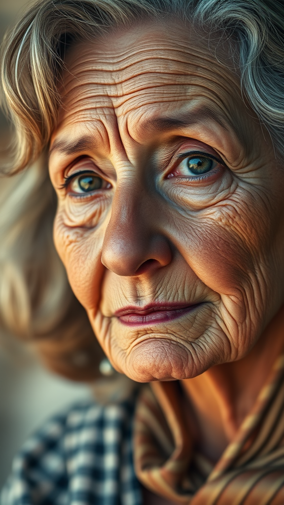 An intimate portrait of an elderly Latin woman with a shoulder-length, softly curled hairstyle, her skin slightly sun-kissed, captured in gentle natural light. Her face is lined with experience and emotion, her eyes deep and expressive, revealing stories untold. The setting exudes a serene yet powerful presence, the details vivid and finely rendered, showcasing every subtle texture. The composition is captured in ultra-high definition, creating a lifelike, almost three-dimensional effect.