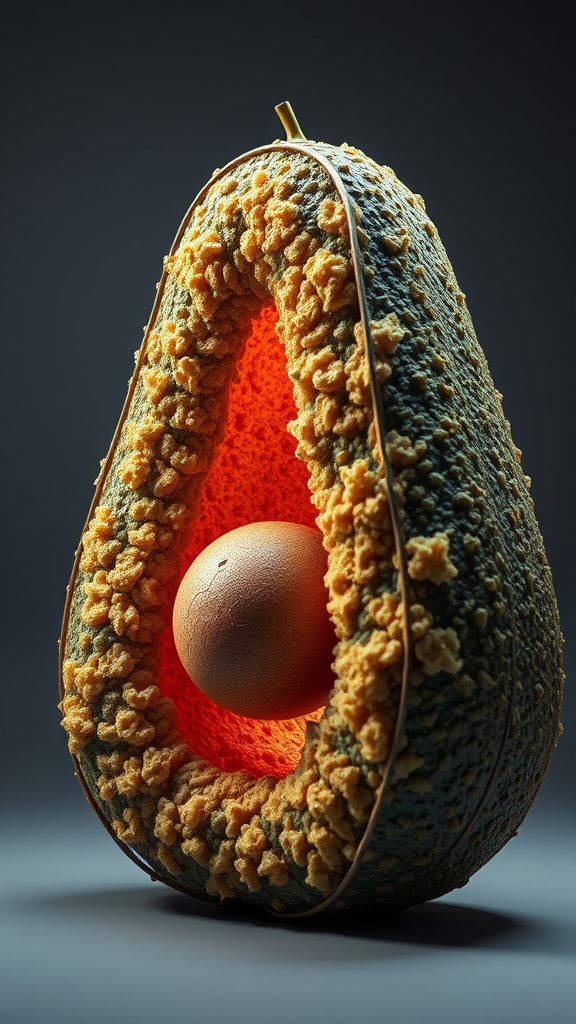 An intricate 3D letter A with the rich, textured surface of an avocado, appearing fluffy and realistic; crafted using high-quality rendering, employing both Blender and Unreal Engine techniques, enhanced with vibrant volumetric lighting that highlights every detail, resulting in an extraordinary visual experience with an imaginative twist.