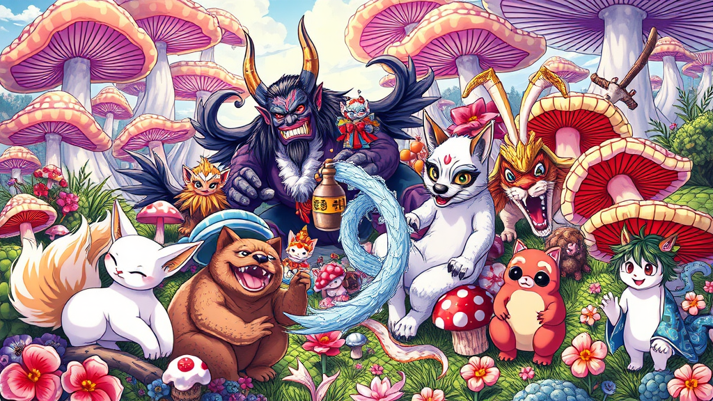 An intricate and colorful illustration depicting a lively scene with a group of mythical characters: Kitsune with many tails and a playful grin, Nekomata lounging gracefully, Tengu with his distinctive long nose and wings, a formidable Oni with an imposing stance, a mischievous Tanuki holding a sake jug, the ethereal Yuki-Onna surrounded by a chilling aura, Jorogumo elegantly weaving a web of threads, a mysterious Yama-Oroshi lurking in the shadows, and a cheerful Kijimuna with leaves in its hair. The background showcases a fantastical mushroom-filled landscape reminiscent of a vibrant dreamscape, with towering fungi and vivid flora. Rendered in a vivid manga style, the artwork captures the magic and wonder of this mythical world in stunning HD, bringing the cultural legends to life in a mesmerizing composition.