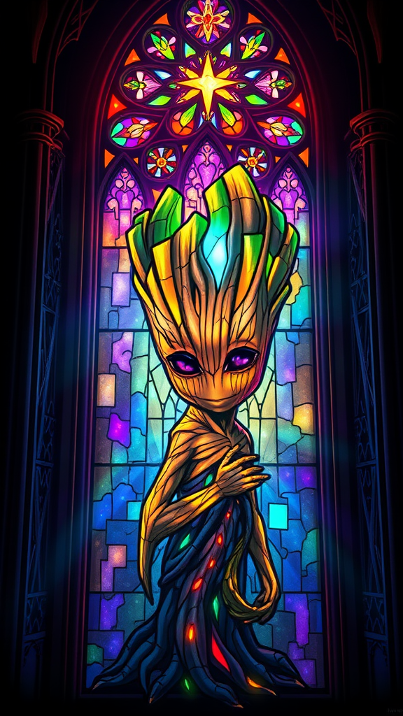 An intricate and colorful stained glass window featuring Baby Groot, glowing with radiant light in a Gothic cathedral style. The design is highly detailed, capturing a religious and mystical aura. The backlit scene highlights the vibrant hues, casting mesmerizing patterns akin to a celestial tapestry. This digital painting concept art draws influences from Clive Barker, H.R. Giger, and Brom, blending their styles to create a uniquely fantastical and otherworldly ambiance, echoing the trending vision seen on Artstation.