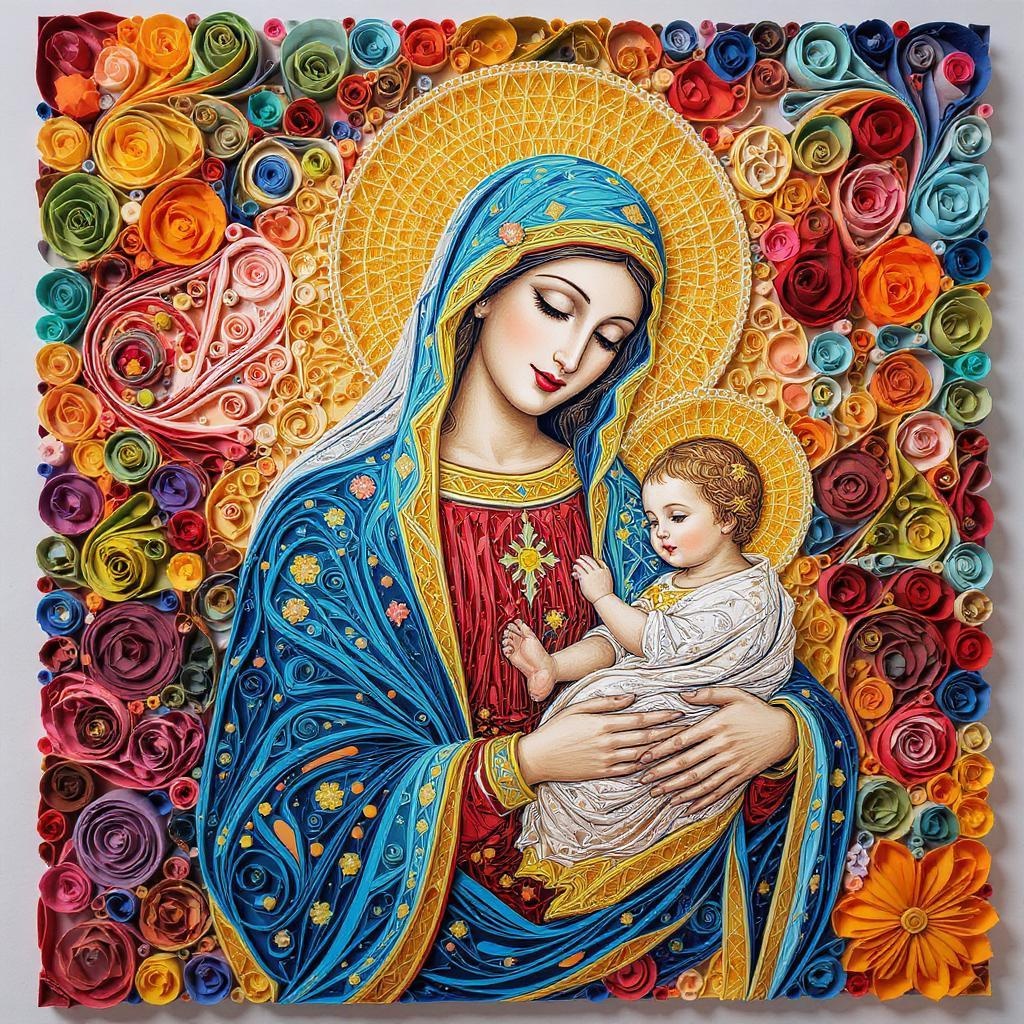 An intricate and vibrant paper quilling artwork depicting the Virgin Mary gently cradling baby Jesus, surrounded by an array of vivid colors and swirling patterns. The piece combines delicate coils and spirals to create a harmonious blend of traditional and contemporary elements, with exquisite detailing on Mary’s serene face and the tender expression of baby Jesus. The background features a symphony of lively hues, enhancing the warmth and divinity of the scene.