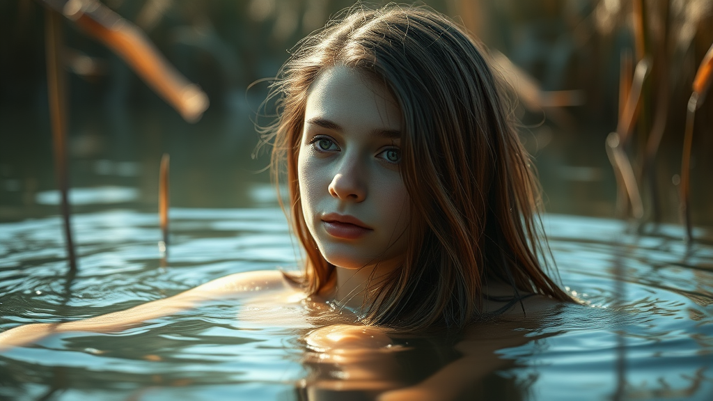 An intricate close-up portrait of a long-haired teenager enjoying a tranquil bath in a serene lake, surrounded by gently swaying reeds, capturing an atmosphere of natural beauty. The scene is illuminated with a soft lens flare and dappled shade, creating a dreamy, ethereal effect. Influences from the masterful techniques of Jeremy Lipking and Antonio J. Manzanedo are evident, blended into a digital painting style with 3D rendering elements, subtly infused with a touch of whimsical cartoon charm. The composition is a harmonious masterpiece, exuding the highest quality of detail and artistry.
