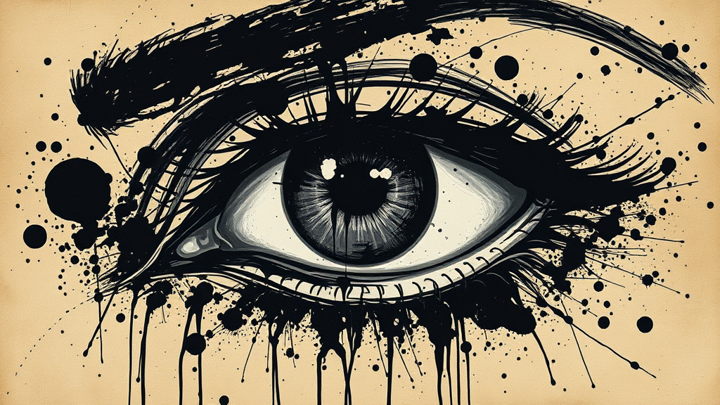 An intricate depiction of an eye, vividly splattered with chaotic paint and stains on textured sepia paper, evoking a sense of mystery and depth. Crafted in a noir comic art style intertwined with gothic black and white aesthetics, the artwork draws from the dark, theatrical essence of angura kei. Monumental ink strokes convey boldness, while chiaroscuro techniques highlight dramatic contrasts, creating an enigmatic portrait. The scene melds biomorphic shapes with the fluidity of oil painting, capturing a timeless yet edgy allure.