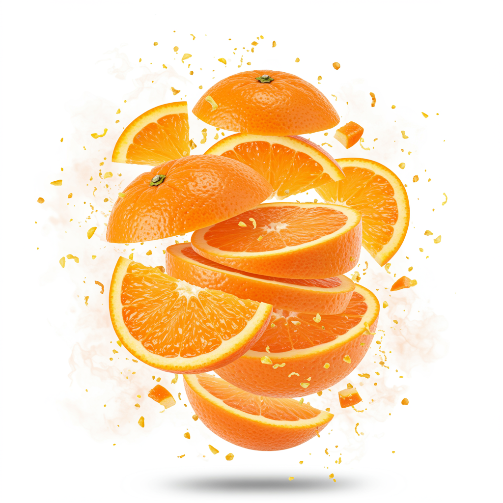 An intricate, dynamic composition of a vibrant orange fruit, dramatically exploded into floating segments and intricate layers. Each piece is suspended in mid-air, showcasing the juicy inner textures and bright hues, surrounded by intricate splatters of zest. The background is a minimalist white, allowing the bold colors and details of the fruit to dominate the scene, interspersed with subtle hints of citrus-infused mist capturing the essence of a fresh, zesty burst.