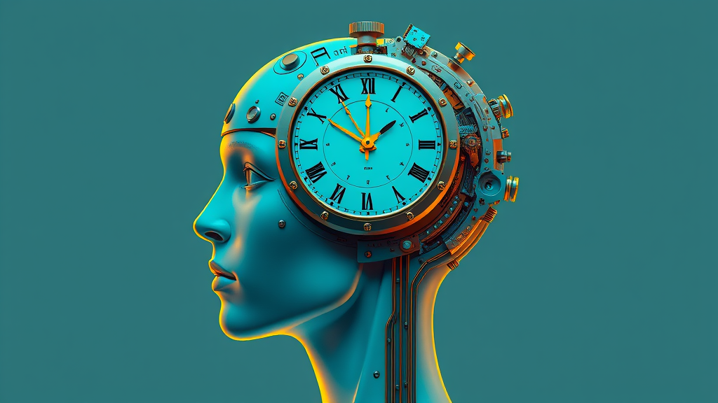 An intricate illustration of a human head with a mechanized clock integrated on top, designed in a style of futuristic contraptions. The rendering is hyper-detailed and realistic, utilizing a color palette of cyan and amber. The clock features gears and circuits, showcasing mechanized precision. The head and clock form a symmetrical composition, embodying a lowbrow aesthetic. The design echoes the meticulous craftsmanship of a daz3d environment, set against a backdrop that accentuates the raw, innovative style.
