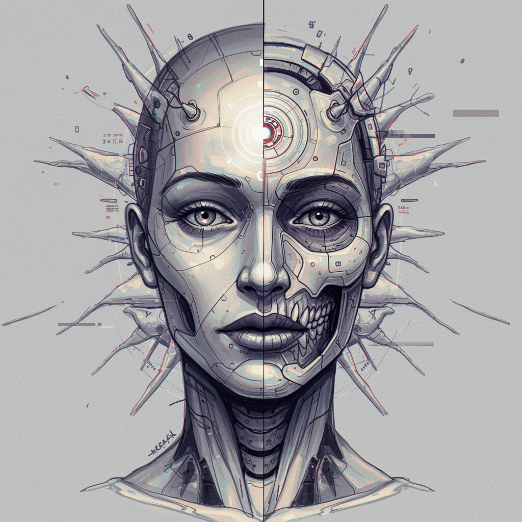 An intricate illustration of a mesmerizing neural network entity, featuring a half robotic skeletal face alongside stunningly detailed facial features. Viewed from a 45-degree angle, this artwork elegantly combines elements of a holographic, electro aesthetic. It boasts maximum detail with an intricately detailed yet slightly blurred, plastic-like texture, and a touch of graininess. The concept includes elements of duplication and subtle imperfections such as poorly drawn anatomy, extra limbs, and text artifacts. There is a suggestion of an artist's signature or watermark subtly integrated, along with JPEG-like artifacts that add to the overall enigmatic quality.