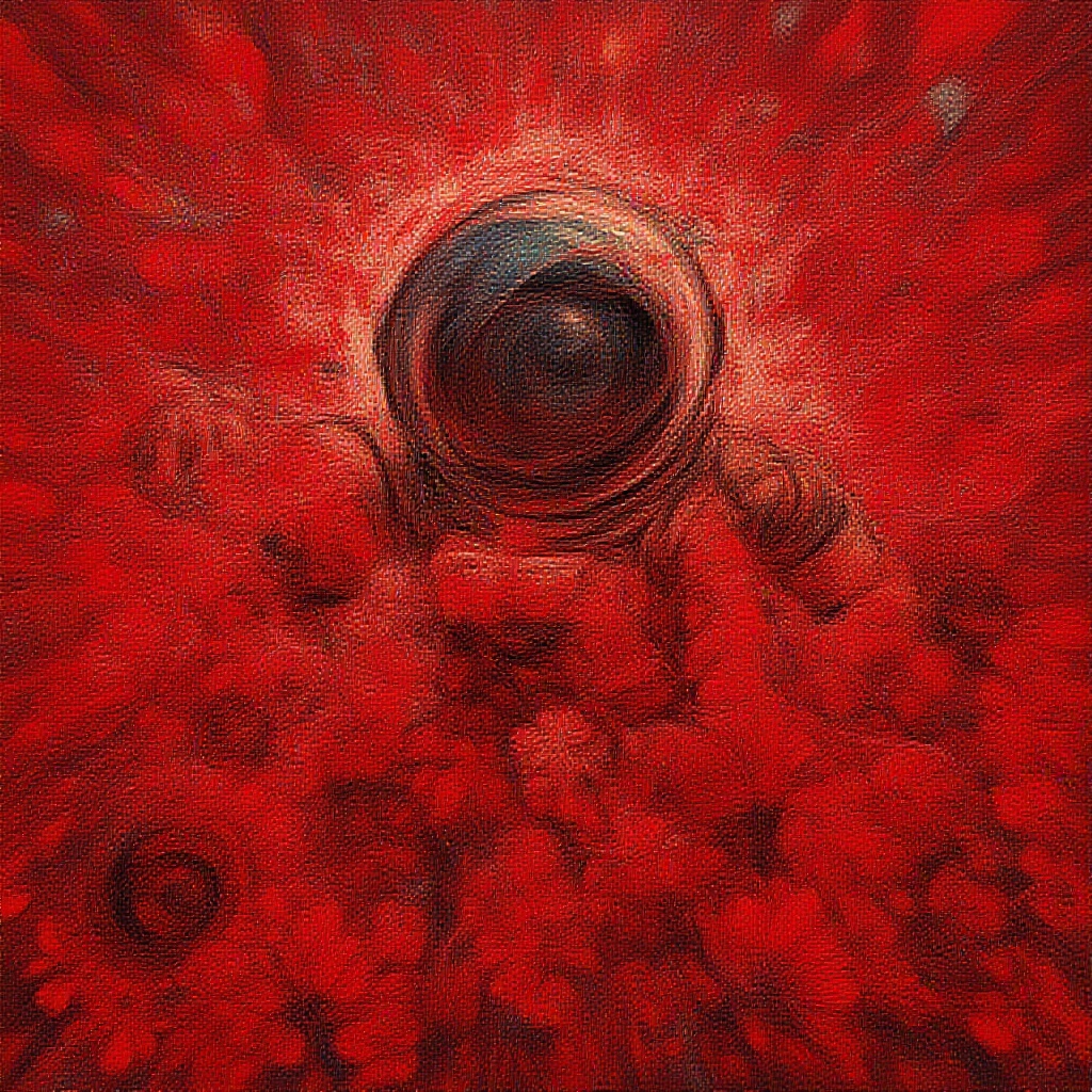 An intricate illustration of an astronaut with a helmet bursting into a vibrant floral explosion, blending the precision of anatomical drawing with elements of abstract art. Bold splashes of coquelicot red mix with dripping paint effects, creating a dynamic, surreal scene. The use of depth of field emphasizes the contrast between the detailed figure and the dreamlike, blooming background, capturing an otherworldly yet organic essence.
