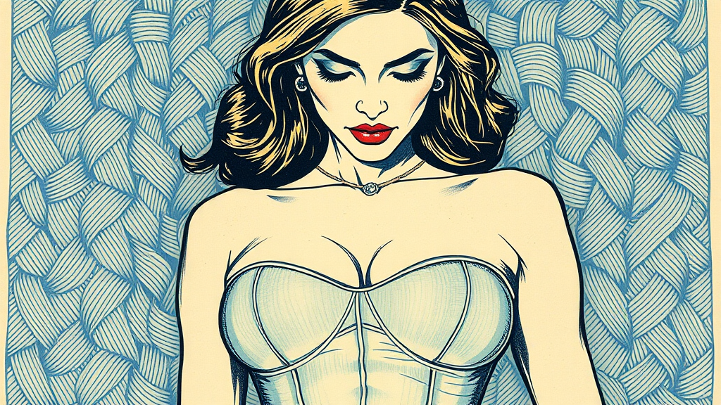 An intricate intaglio etching depicts a commanding woman exuding modern power and allure. This exquisitely beautiful, slender, and confident figure gazes assertively downward. Her attire features a skin-tight latex bustier in minute detail with light blue and light green shades. A background of plaited line patterns enhances the composition. The mood is sensuous and stimulating. The piece is created using colour lithography and engraving with ultra-fine lines on cotton paper. This evocative representation combines traditional printing techniques akin to those used in currency, symbolizing the compelling allure of female strength. The artwork captures a three-quarter shot from below, highlighting her dominance.