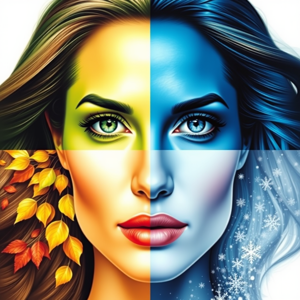 An intricate portrait of Angelina Jolie's face divided into four distinct quadrants, each symbolizing a different season. The top left quadrant bursts with vibrant green hues, representing the fresh, budding essence of spring. Adjacent, the top right quadrant glistens with deep blue tones, capturing the intensity and warmth of summer. Below, the bottom left quadrant is bathed in rich yellows and oranges, where gentle leaves cascade, embodying the transition and warmth of autumn. Finally, the bottom right quadrant is a serene expanse of white, delicately dusted with snowflakes, conjuring the tranquil and crisp atmosphere of winter.