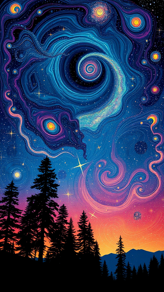 An intricate psychedelic landscape depicting an evening sky filled with twinkling stars and silhouetted trees against it, inspired by the styles of Martin Ansin and Emily Carr. The scene features a psychedelic overload of swirling vortexes, with multilayered dimensions creating depth. The naturalistic color palette enhances the mystical atmosphere, blending vibrant hues in a harmonious dance. The galaxies and nebulae seem to pulse and shift, drawing the viewer into an endless expanse of cosmic wonder.