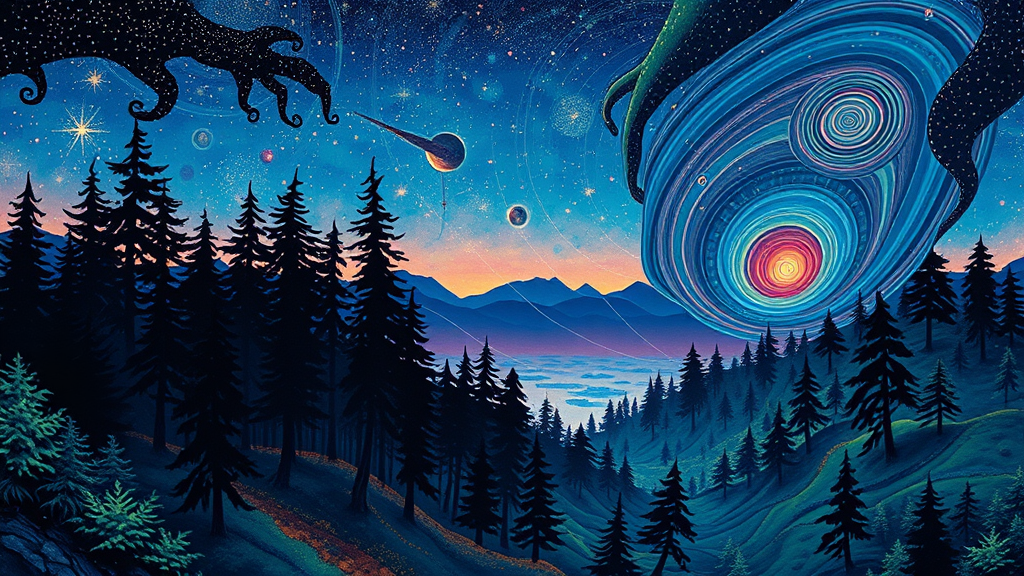 An intricate psychedelic landscape unfolds with an evening sky adorned by twinkling stars, silhouetted against a backdrop of towering trees. This surreal vista blends the artistic styles of Martin Ansin and Emily Carr, exuding an overflowing psychedelic richness that transcends ordinary reality. Multilayered dimensions unfold, inviting exploration into their depths, as a naturalistic color palette suffuses the scene with hues of deep blues and radiant greens. Swirling vortexes of energy and light weave through the trees, creating hypnotic patterns that guide the eye across the horizon. The cosmos and nature dance together in a harmonious display of vibrant artistry.