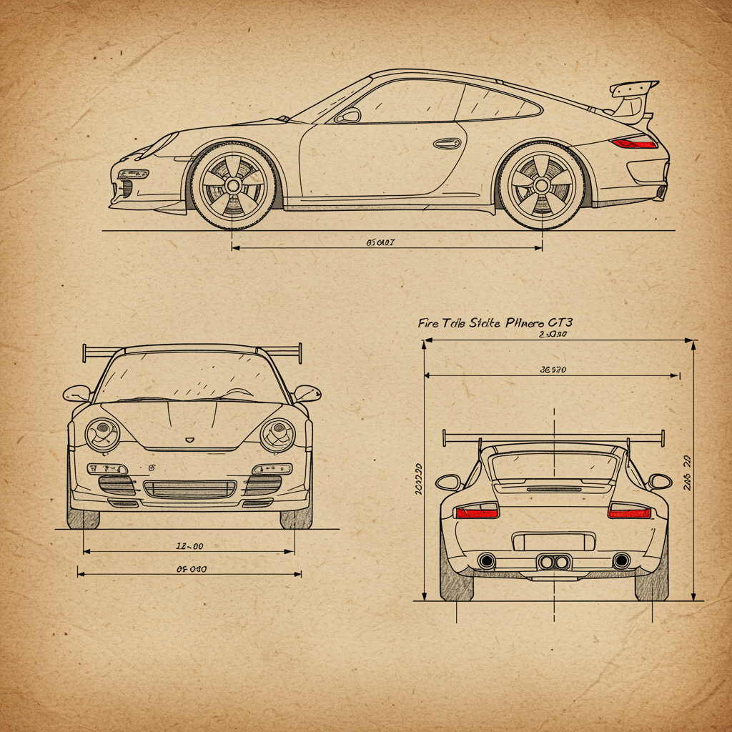 An intricate vintage-style technical drawing of the Porsche 911 GT3 on aged parchment paper, featuring an upper view and a front view. Detailed lines trace the iconic curves and sleek design of the car, with annotations and hand-written notes adding a personal touch, detailing measurements, performance specs, and unique design features. Slight creative adjustments enhance the drawing, maintaining the essence of the GT3 while adding artistic flair, such as subtle embellishments or imaginative interpretations of aerodynamics.