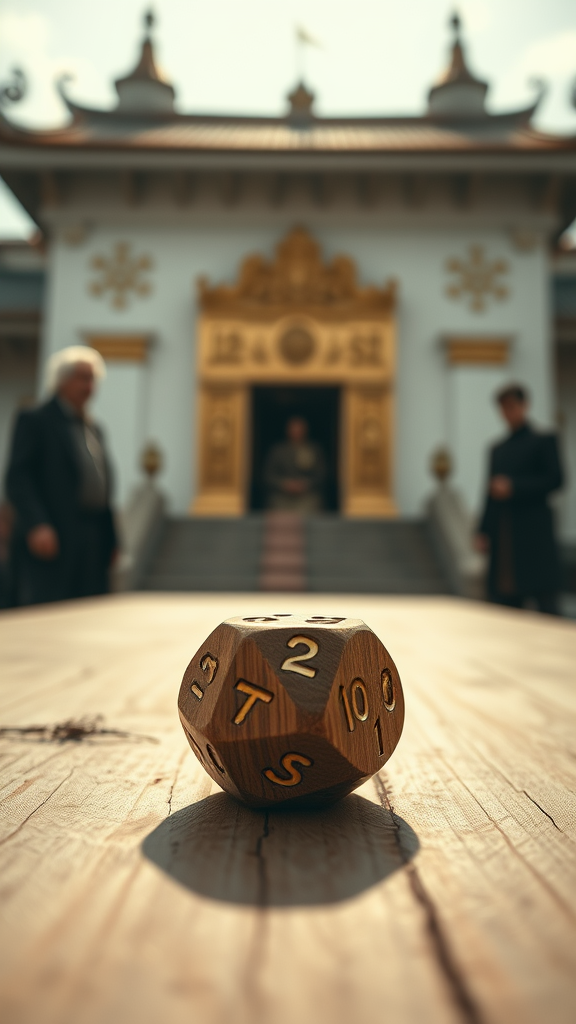 An intricately carved eight-sided dice rests on a sun-bleached wooden table, its numbers glowing softly against the backdrop of a white and gold temple. The ambient light filters gently through the scene, casting a low-contrast aura that enhances details with heightened sharpness. The shallow depth of field draws attention to the dice, capturing an intimate moment as it dominates the frame. In the blurred background, the figures of an elderly man and an Ian McKellen lookalike add a sense of timelessness to the scene. The minimalist composition, featuring only the dice, table, and temple, evokes a dramatic and enigmatic atmosphere, accentuated by subtle effects that hint at hidden stories within this frozen moment.