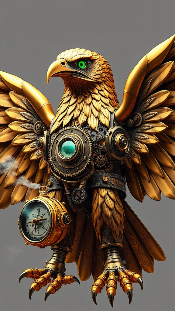 An intricately designed steampunk eagle with gleaming bronze and brass feathers that interlock like clockwork machinery, its eyes glowing with an emerald green light. The powerful wings are adorned with complex gears and pistons that whir and hiss softly as they move. Its talons, crafted from polished steel, clutch a vintage compass, the needle spinning lazily. Exhaust vents along its back release puffs of steam, giving the eagle a mechanical life sensation, while intricate engravings of swirling patterns decorate its breastplate, reflecting the ingenuity and artistry of its makers.