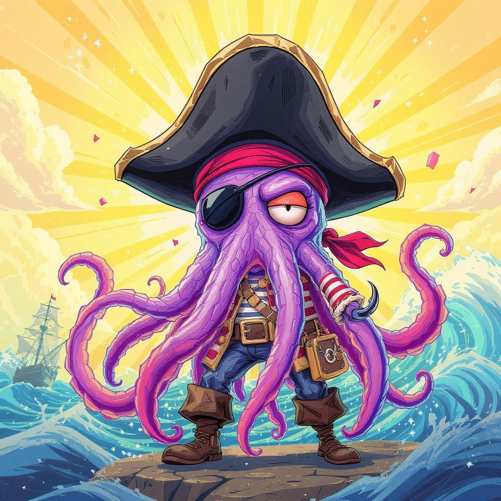 An intricately detailed anthropomorphic jellyfish pirate character posed in a dynamic portrait, illuminated from behind by radiant light rays. The scene captures a vibrant and trendy cartoon style, reminiscent of popular artstation creations, with a closeup showcasing expressive multi-faceted heads and swirling tentacles. This vector art piece features whimsical clipart elements and subtle distortions, adding a fantastical and adventurous flair to the jellyfish pirate's unique and engaging design.