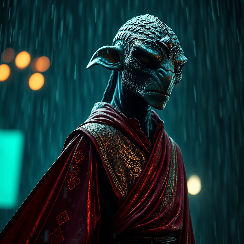 An intricately detailed anthropomorphic Targarian in shimmering, ornate robes stands solemnly in pouring rain, capturing emotions with hyper-realism and vivid details, framed in an awe-inspiring composition. The scene is brought to life with dramatic, epic cinematic lighting, shot in an 8k resolution reminiscent of a Hasselblad H6D-400c Multi-shot. The image conveys intense emotion and depth, featuring a portrait aspect ratio of 1:2 with a creative twist and dynamic flair, introducing an element of unpredictable beauty.