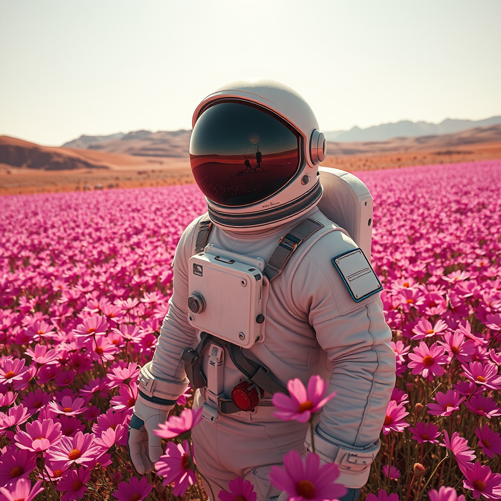 An intricately detailed astronaut in a realistic, meticulously textured space suit stands amidst an endless expanse of pink cosmos flowers on Mars. The astronaut's suit looks authentic, showcasing visible fabric creases, glimmers on the visor, and subtle scuff marks hinting at its journey. The cosmos flowers are vibrant and lofty, nearly reaching the astronaut’s chest, gently bending in the whispering Martian winds. The scene is captured from a broad aerial vantage point, revealing the astronaut enveloped in the pink floral sea that contrasts with the rusty Martian terrain. The sky above is clear and radiant, with gentle sunlight bathing the scene, casting soft and diffused shadows that enhance the ethereal yet tangible quality of the moment.
