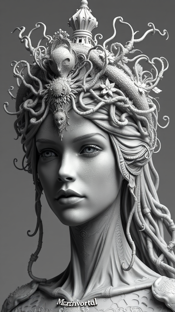 An intricately detailed black and white sculpture of a regal woman adorned with an ornate, otherworldly crown, crafted in a hyper-realistic sci-fi style. Her expression exudes a blend of wisdom and mystery, while intricate textures and patterns on her skin mimic the complexity of nature. The crown is a fusion of organic and technological elements, with tendrils and mechanical embellishments interwoven seamlessly. Her features are strikingly detailed, capturing the essence of a futuristic yet timeless being, exhibiting a mastery reminiscent of zbrush artistry, elegantly blurring the lines between nature and advanced technology.