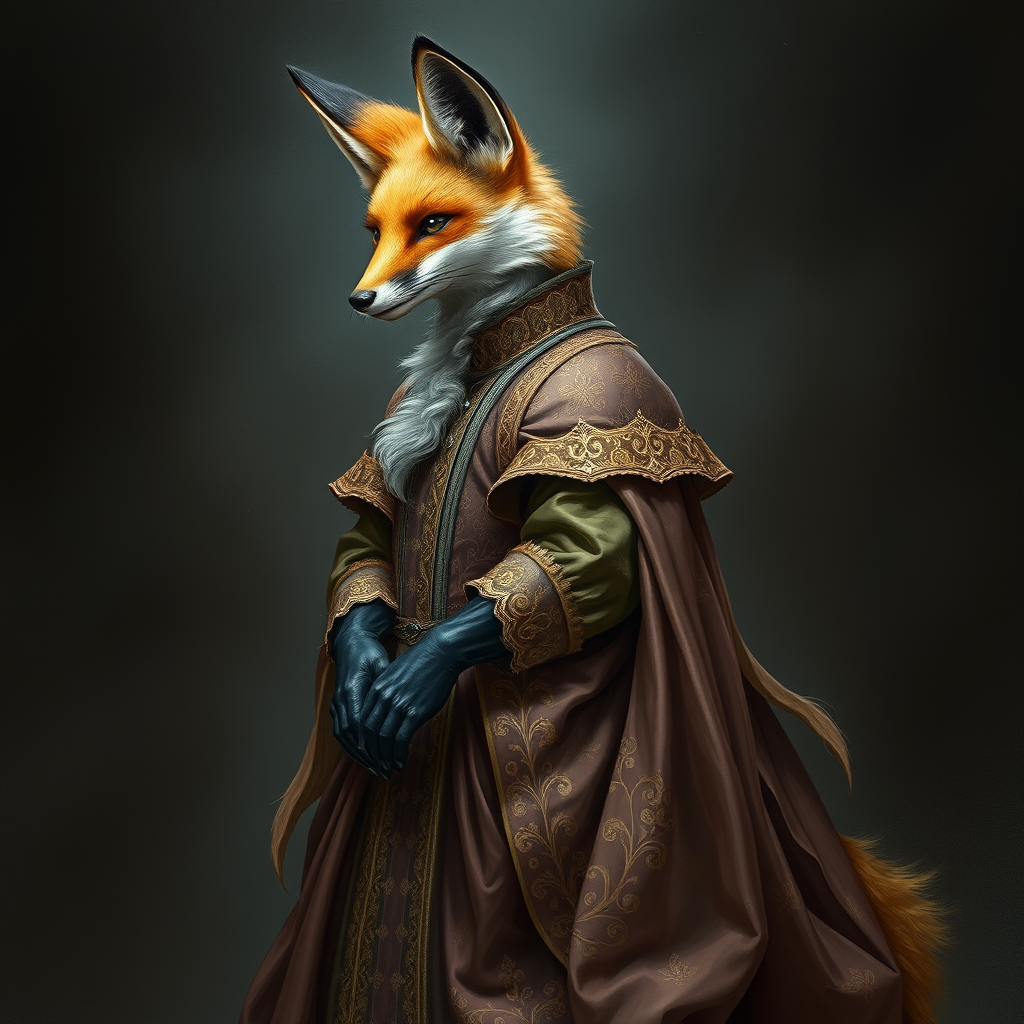 An intricately detailed concept art of an anthropomorphic fox adorned in an opulent medieval gown, blending elements from the artistic styles of Peter Morbacher, Anthony Van Dyck, Aleksi Briclot, and Alexandre Cabanel. The fox stands gracefully against a dark, gothic background, its fur rendered with exquisite texture and depth, capturing a sense of noble elegance. Ornate patterns embellish the flowing fabric of the dress, accentuating its historic authenticity and artistic finesse. Each feature, from the expressive eyes to the delicate paws, is illustrated with exceptional precision, weaving a rich tapestry of medieval and fantasy influences. The atmospheric contrast between the dark backdrop and the vibrant attire highlights the ethereal presence of the character, creating a timeless portrayal that resonates with both grandeur and mystique.