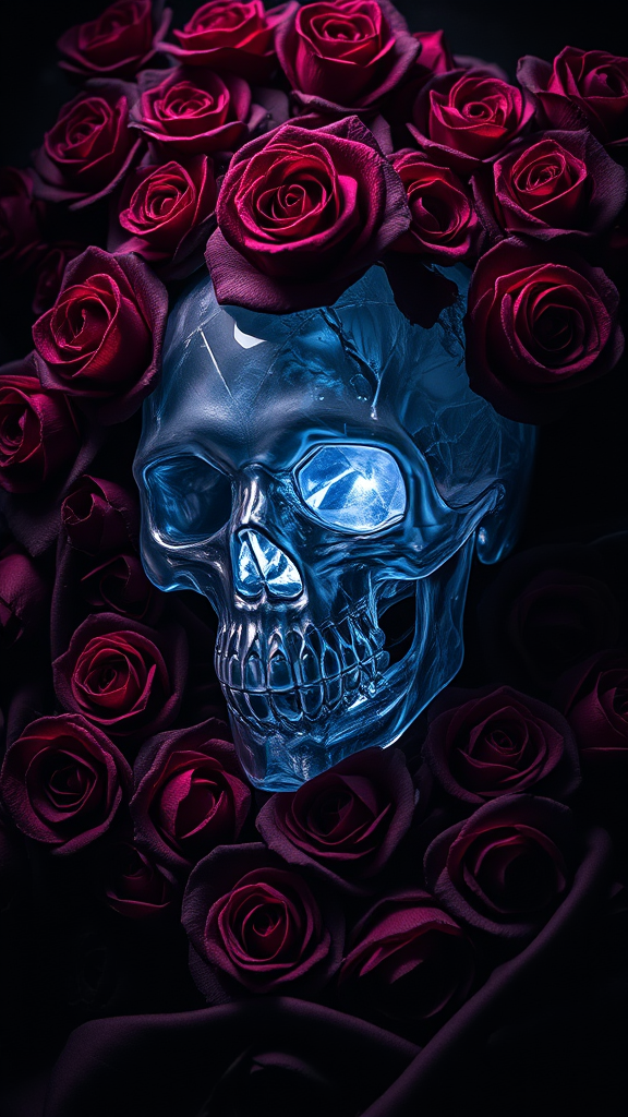 An intricately detailed crystal skull enveloped by an abundance of dark, velvety roses, exuding an ethereal and magical aura. The scene is bathed in cinematic lighting, casting dramatic shadows and highlights that bring the composition to life, evoking a sense of dark fantasy. With extreme detail, the setting is richly ornate, reminiscent of the fantastical style of Brian Froud. Each petal and facet gleams with surreal clarity, creating a spectacular vista in UHD, HDR, 8k resolution, perfect for a breathtaking wallpaper of otherworldly beauty, radiating mystery and enchantment.