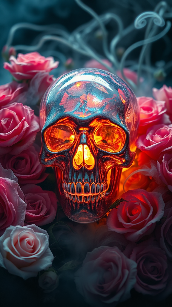 An intricately detailed crystal skull nestled amidst a cascade of vibrant roses, exuding an aura of dark fantasy and ethereal magic. The scene is illuminated with cinematic lighting, casting shimmering reflections off the crystal's surface. This epic shot showcases ultra-high definition, rich in color and depth, reminiscent of Brian Froud's enchanting style. The ornate composition serves as an exquisite wallpaper, inviting viewers into a world of fantasy art with a breathtaking UHD, HDR 8k resolution. The addition of gentle mist creates an otherworldly ambiance, enhancing the mystical allure of the scene.