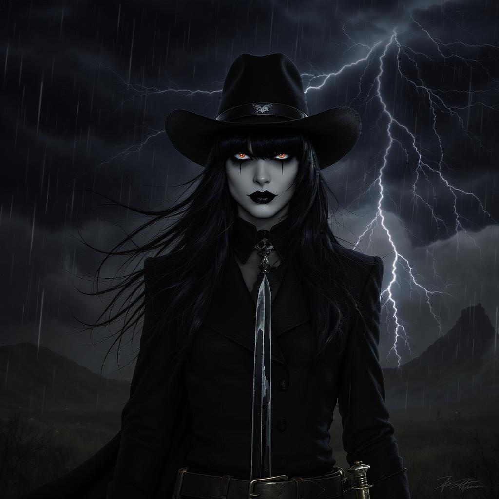 An intricately detailed digital illustration, high resolution, masterpiece showcasing a character with jet-black hair styled long with distinctive bangs, and piercing black eyes. The composition is a cowboy shot capturing the character from the front, gazing directly at the viewer with a grumpy expression and an intense glare. They wield a short sword, poised and ready. The scene is set at night under dramatic, dark ambient lighting, with flashes of lightning illuminating the background. The overall mood is reminiscent of a gothic Western, inspired by the iconic presence of Wednesday Addams, with the stormy sky adding a dynamic, electrifying atmosphere.
