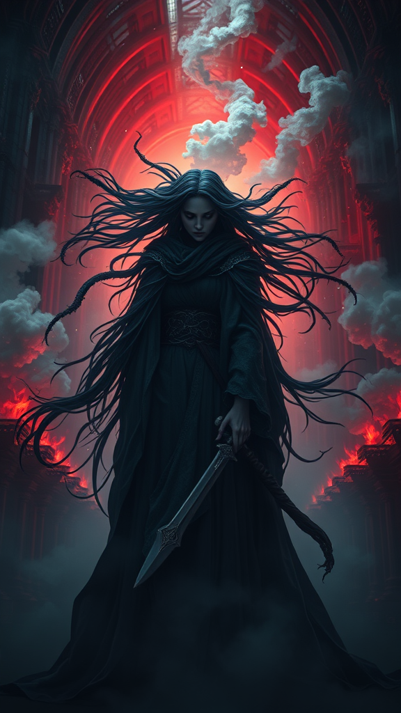 An intricately detailed hyper-maximalist cinematic portrayal of royalty shrouded in darkness, with long wind-swept hair and flowing garments evoking the magic of Magic: The Gathering, set against vibrant contrasting hues. Enveloped in clouds of toxic fumes and spirals of smoke, the scene unfolds within the vast, shadowy corridors of a grand castle. Inspired by the style of Massimo Caggese and infused with an ominous intricacy reminiscent of Moebius, this composition captures a poised, breathtaking figure. Utilizing ArtStation and Unreal Engine aesthetics, the setting is enriched by dramatic lighting and shadows, interwoven with orthodox symbolism and concept art flair. The ambient magic realism is heightened by ambient occlusion and volumetric lighting, crafting an emotional tapestry that resonates at 8k resolution. The piece combines tribal dark fantasy elements, creating a vivid tableau that echoes with depth and narrative.