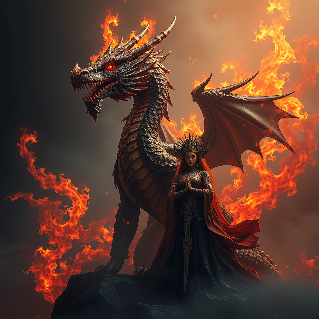 An intricately detailed hyper-maximalist cinematic vision features a majestic, colossal fire dragon adorned in regal splendor, standing beside his enchanting queen of fire. The scene conveys the dramatic allure of Magic the Gathering, enveloped in swirling flames against a backdrop of dense, dark fog. The composition is imbued with ominous intricacies and dazzling poses, reminiscent of an ArtStation masterpiece. The perfect balance of composition and dramatic ambient lighting casts profound shadows, evoking a sense of orthodox symbolism. This exceptional concept art captures the essence of magic realism in 8k resolution, infused with tribal dark fantasy elements that enhance its ethereal allure.
