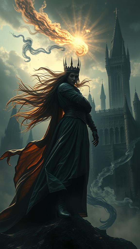 An intricately detailed hyper-maximalist scene unfolds, revealing a cinematic royal figure ensconced in an atmosphere of profound darkness. Their long, windblown hair and flowing cloth ripple dramatically against a backdrop of a colossal, shadowy castle. Infused with elements of Magic the Gathering, vibrant contrasts bring life to swirling clouds of toxic fumes and spirals of ghostly smoke that twist through the air, reminiscent of Massimo Caggese's style. The pose is striking and elegant, reminiscent of a gallery on ArtStation, crafted with the precision of Unreal Engine. Dramatic lighting and shadows cast a mystical, orthodox symbolism onto the scene, amplified by the ambient magic realism. The composition is enriched by ambient occlusion and volumetric lighting that accentuates emotional and tribal dark fantasy themes. Every element resonates with 8k resolution crystal clarity, ensuring that viewers are captivated by the ominous beauty of this surreal spectacle.