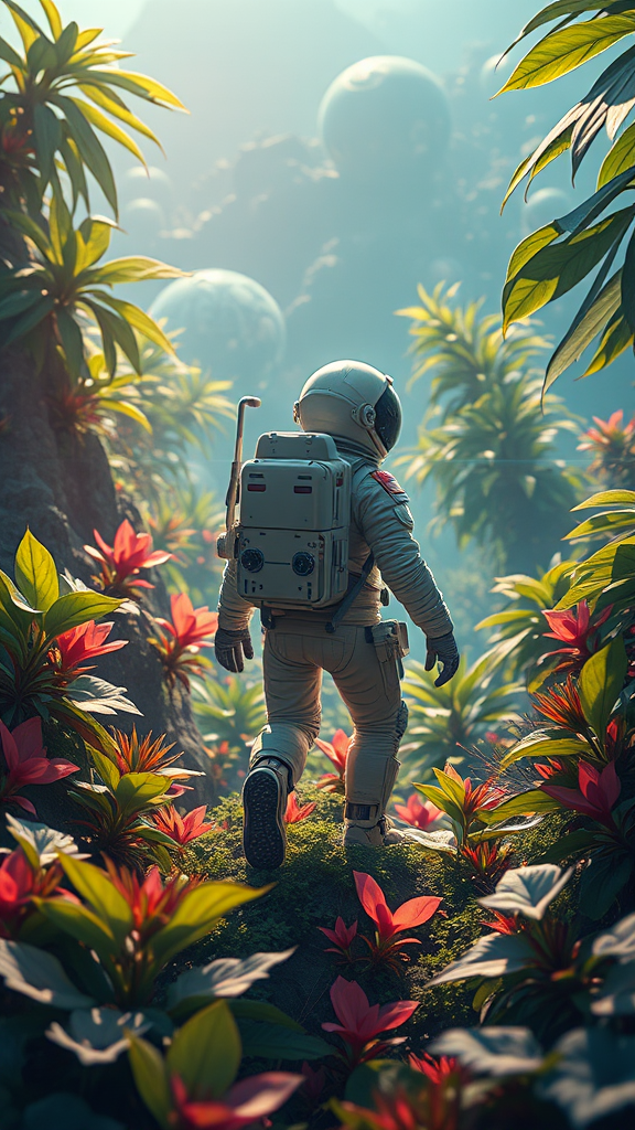 An intricately detailed illustration depicts an astronaut exploring a lush, verdant world. The scene is a masterpiece of sci-fi atmospheric artistry, rendered in sharp focus and stunning 4k resolution. The landscape is filled with vibrant alien flora, softly glowing under an ethereal light that dances across the leaves. The astronaut's suit is a marvel of futuristic technology, reflecting the beauty of this otherworldly paradise. This trending image on artstation captures the awe and wonder of interstellar exploration, enhanced with artistic embellishments and nartfixer-inspired refinements, revealing a scene that feels both fantastical and captivatingly real.