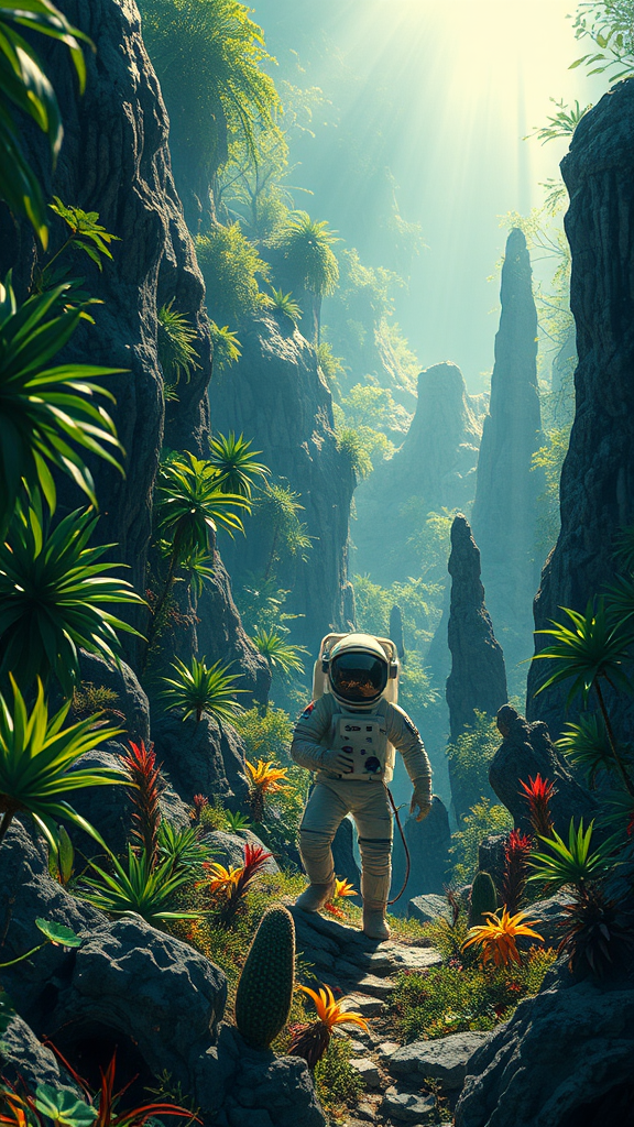 An intricately detailed illustration of an astronaut exploring a lush, verdant alien world, showcasing a masterpiece of sci-fi atmosphere in sharp focus and vibrant colors. The scene captures breathtaking details with a 4k resolution quality, highlighting a landscape filled with exotic plant life and surreal rock formations. The composition features rays of sunlight piercing through alien foliage, casting dynamic shadows and creating a sense of wonder and discovery. This artwork is trending on art platforms, pushing the boundaries of imagination and technique, with slight creative enhancements to evoke an otherworldly charm.
