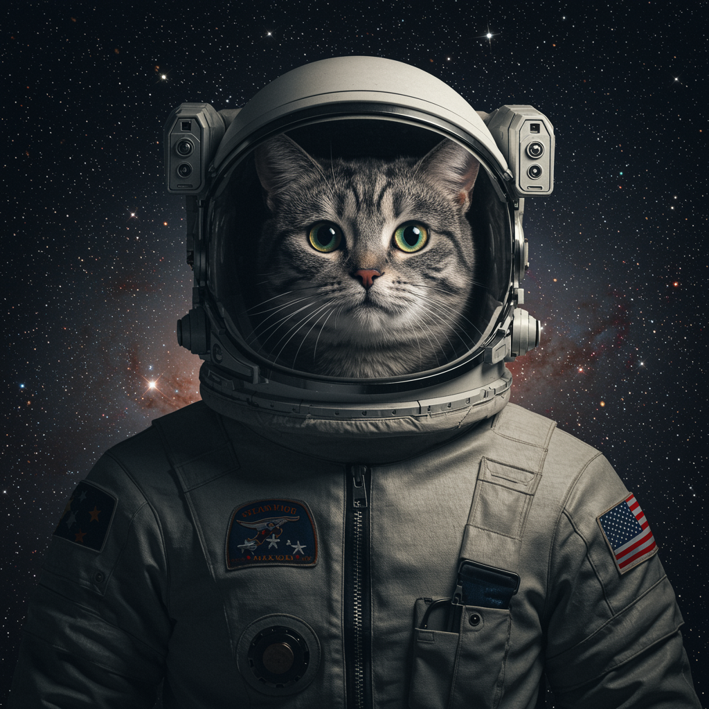 An intricately detailed image of a cat donning a tailored spacesuit, its sleek fur visible through transparent helmet panels, set against an expansive galaxy backdrop glimmering with stars, capturing both a sense of adventure and the wonder of the cosmos in vivid, high-definition 8k resolution.