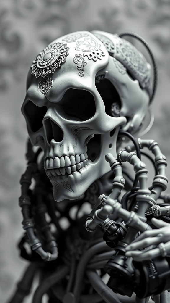 An intricately detailed porcelain reaper skull android face with exquisite cyborg and robotic elements, 150 mm in scale. The scene is lit with beautiful studio soft light and enhanced by a rim light to accentuate vibrant details. The design embodies a luxurious cyberpunk aesthetic, incorporating delicate lace patterns. The hyperrealistic anatomy showcases facial muscles intertwined with cable electric wires and microchips. The android exudes elegance against a beautiful background resembling an octane render, echoing the style of H. R. Giger. The composition is intentionally imperfect, with disjointed, blurry floating limbs, a long neck and body, and exaggerated, malformed hands with too many fingers. A close-up view reveals both beauty and asymmetry, set in a black and white, grainy ambiance, showcasing creative imperfections and extra limbs with a distinctively deformed appeal. The overall visual is reminiscent of a doll-like construct with blurred and disfigured features, striking a balance between sophistication and unsettling artistry.