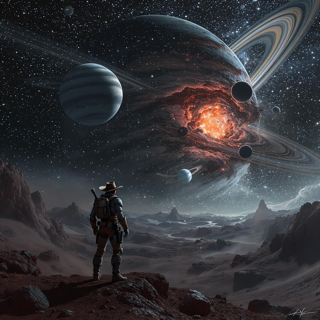An intricately detailed portrait of a sprawling alien landscape where a space cowboy gazes into the starry expanse, as planets dramatically collide in the cosmos above. The scene is brought to life in 8k resolution with extreme photorealistic detail, featuring cinematic lighting and a beautifully composed shot. Dust particles drift through the air, adding texture to this expertly crafted masterpiece. Enormous rings arc across the sky, enhancing the celestial vista. The portrait blemishes with intentionally distorted elements: the cowboy's anatomy hints at alien imperfections with extra digits and oddly shaped limbs; the scene includes abstract and surreal details like floating limbs and multiple nostrils. Artist errors like text, error-prone elements, and random blurs introduce a dreamlike quality, while visual mutations such as misplaced eyes and redundant limbs give it an otherworldly aesthetic. Signature marks and jpeg artifacts suggest a digital creation, adding layers to the mythical narrative.