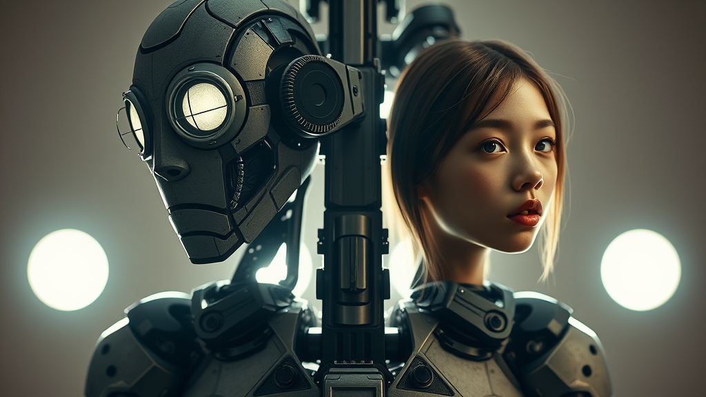 An intricately detailed robot resembling the style of the 'Chappie' film, paired with a minimalist depiction of a girl. The scene features a three-quarter full-body close-up with an intense, blinding light illuminating the figures. The composition includes a dynamic folding of torsos, creating a totem-like appearance with dual heads and faces. The setting suggests an otherworldly or surreal atmosphere, where proportions and anatomy are creatively exaggerated. The textures are intentionally rough, with an emphasis on distorted geometry and asymmetry. Elements include circular windows and cloudy eyes giving a blurred, almost dreamlike effect. The expressions are neutral, adding to the enigmatic ambiance of this unconventional portrait.