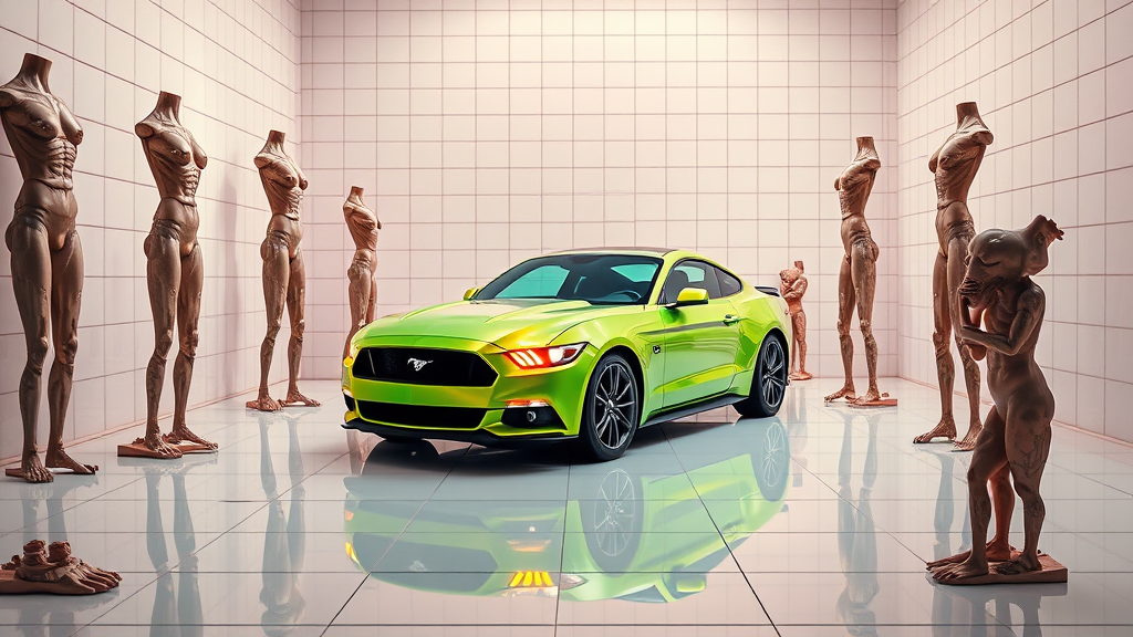 An intricately detailed scene depicting an all-white tiled room with a metallic green Ford Mustang as the centerpiece. The vehicle's surface gleams under bright lighting, which reveals perfect orange highlights and casts pastel colors across the room in a mesmerizing display. The ultra-realistic composition is enhanced by professional color grading, creating a vivid, pristine atmosphere. Surrounding the Mustang are a series of bizarre, surreal sculptures resembling stacked torsos resembling a totem pole. These sculptures feature inaccurate anatomy with extra, missing, or floating limbs, conveying an unsettling sense of mutation and disconnection. The grotesque assemblages appear both ugly and fascinating, with blurry, distorted features that play on themes of amputation and grotesque transformation, inviting viewers to interpret the chaotic scene in their own way. The overall visual is both captivating and disorienting, blending hyper-realism with surreal, distorted elements in a striking commercial photography style.