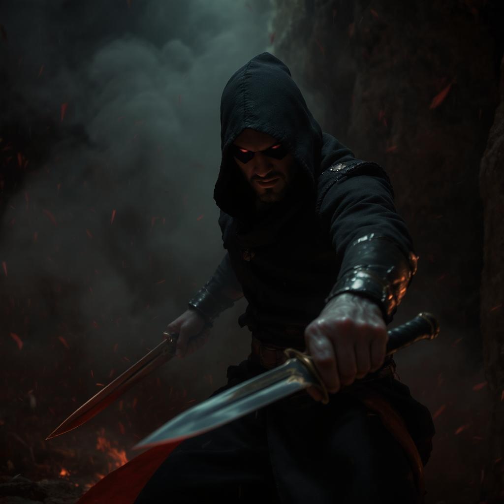 An intricately detailed scene of a man poised as an assassin artfully wielding a knife, with echoes of Rutkowski's cinematic style. The setting is dramatic, accentuated by a masterful use of depth of field and subtle Lightroom enhancements, casting a moody interplay of light and shadow that highlights the tension and skill of the assassin.