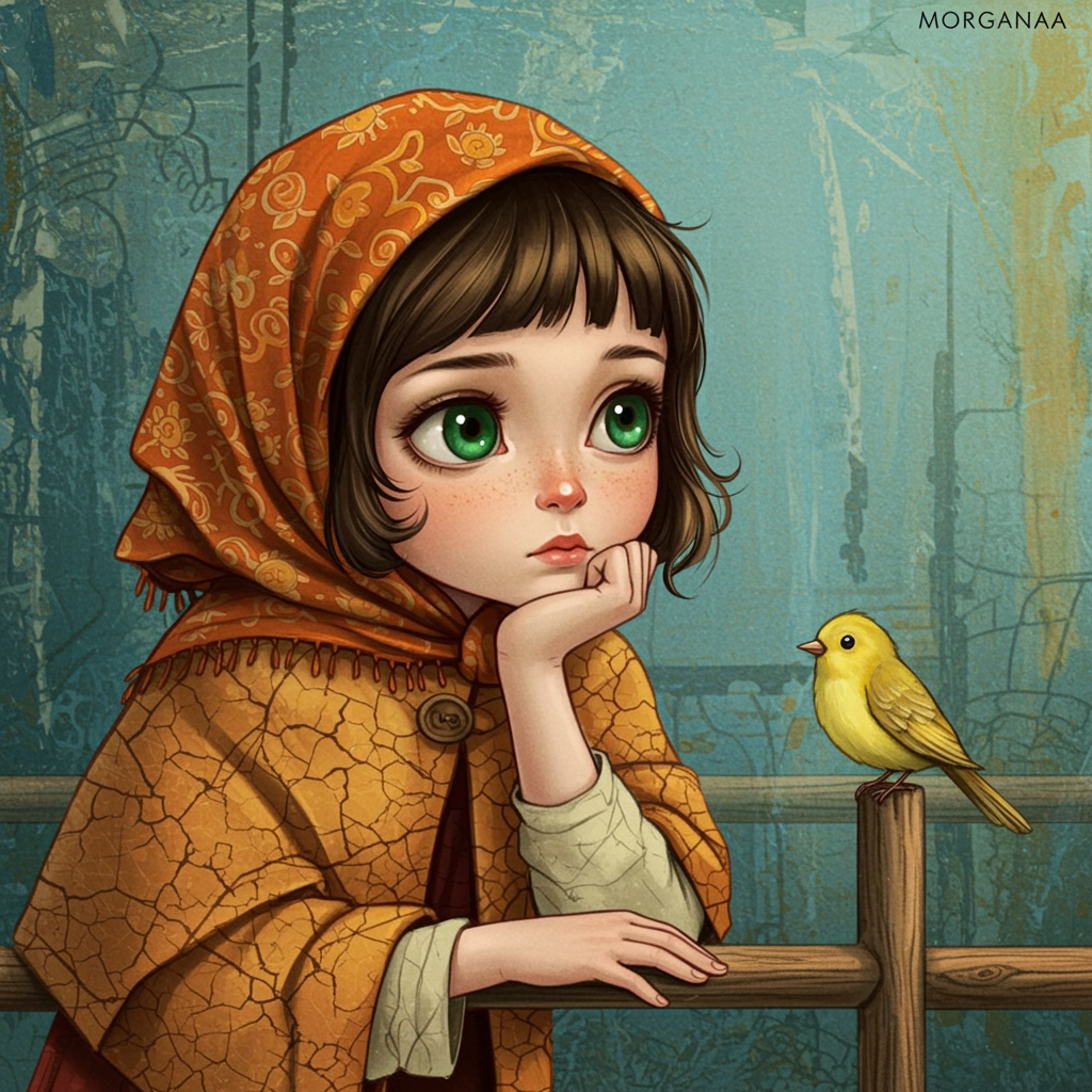 An intriguing illustration features a young girl with delicate features and large emerald eyes, adorned in a richly textured, orange-patterned headscarf and a matching cloak with cracks resembling the surface of weathered pottery. She thoughtfully rests her chin on her hand, her gaze fixed on a small, lively yellow bird perched on a rustic wooden railing. The backdrop is a subdued, artistic tapestry of blue hues, with abstract, faded shapes hinting at an ancient fresco. The scene combines whimsy, nostalgia, and fantasy, rendered with intricate details and a soft, painterly style. In the top right corner, the word 'MORGANA' appears, possibly as a signature or title of the piece.