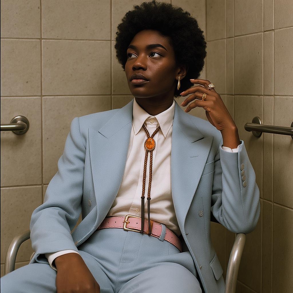 An intriguing retro photograph on FlicFilm Elektra 100 captures a sophisticated model in a muted pastel blue western suit paired with a crisp white short-sleeved shirt. The ensemble is elegantly accessorized with a distinctive bolo tie featuring a captivating orange gemstone, complemented by a pink Italian leather belt. The model, with dark skin and rich, curly brown hair, exudes an air of vintage glamour as they sit gracefully on a chair in a restroom setting, subtly gazing into the distance. Their hand gently grazes their face, drawing attention to the exquisite ring earrings and jewelry they adorn. This fashion editorial, featured in the pages of French Vogue, reflects the modern yet classic style of Jacquemus, capturing a unique blend of retro flair and contemporary sophistication.