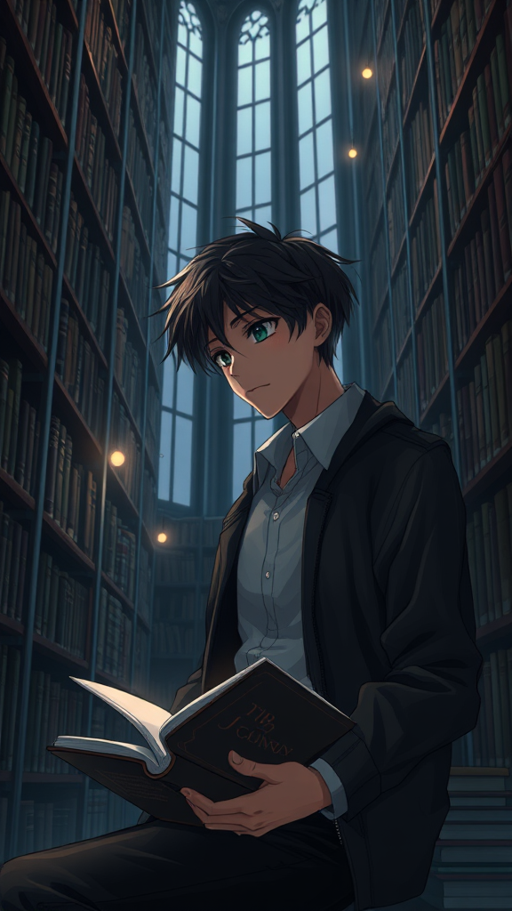 An introverted anime boy finds solace in the dimly lit corners of the library, surrounded by towering shelves of ancient tomes and the soft glow of evening light filtering through tall windows. Immersed in the world of academia, he delves into the pages of a book, the mood steeped in the ambiance of dark academia, as his INFJ nature craves the quiet introspection and depth of understanding only such moments can provide.
