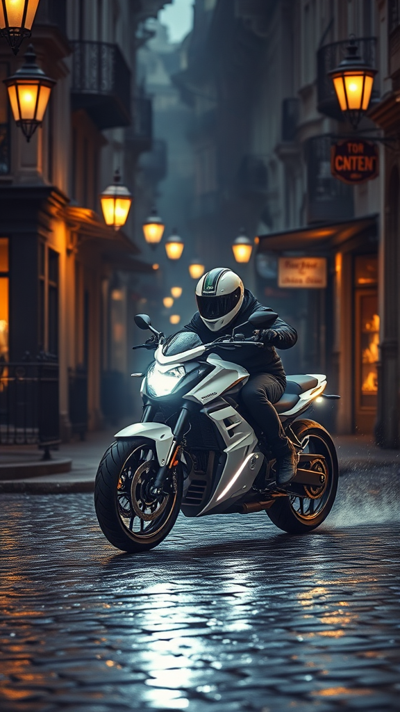 An ivory-colored motorcycle speeds down a cobblestone street reminiscent of the Victorian era, seamlessly blending the grace of yesteryears with futuristic design. It races past glowing gas lamps and intricate wrought-iron fences. The rider leans in, gripping the handlebars firmly as the bike's headlights pierce through the darkness. The elaborate facades of Victorian architecture and vintage storefront signs provide a stark contrast to the high-tech vehicle, creating a mesmerizing fusion of time periods. A light mist hangs in the air, with rain puddles reflecting the bike's vibrant lights, heightening the atmospheric and cinematic essence of the scene.