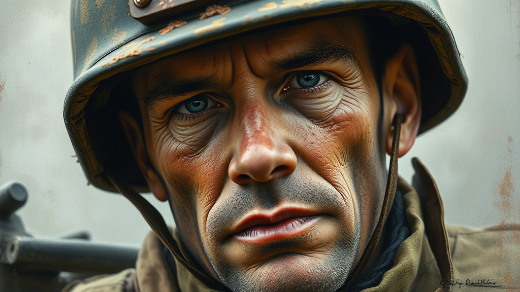 An oblique view portrait of a seasoned World War II U.S. Marine in a rugged, weathered helmet, showcasing a beautifully painted, highly detailed face capturing a lifetime of stories and courage, with artistic influences of Greg Rutkowski and Magali Villeneuve, featuring intricate brushwork and a subtle interplay of light and shadow highlighting the soldier's expressions and the textures of his uniform.