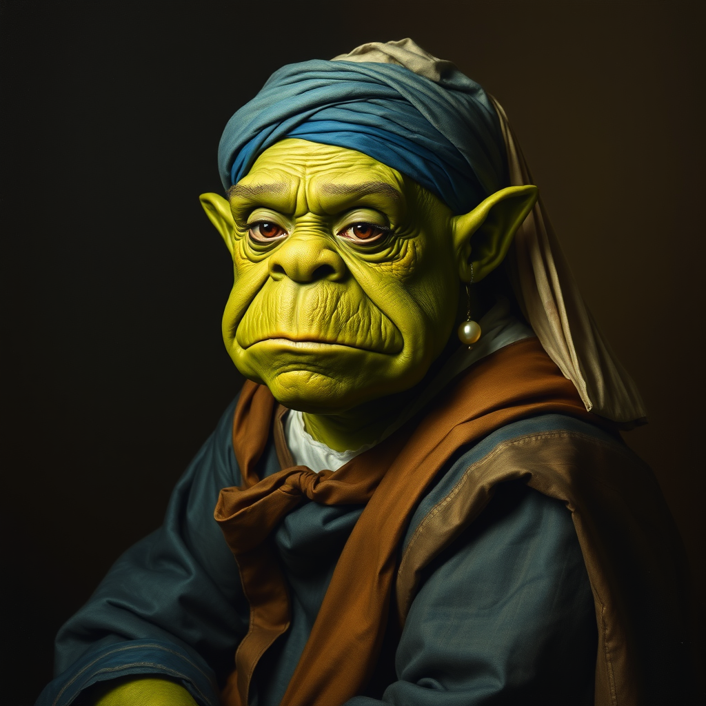 An ogre sits against a dark, soft background, its green skin softly illuminated with the masterful chiaroscuro technique characteristic of Vermeer. The ogre's large, expressive eyes reflect a surprising innocence, while its features are rugged yet gentle. Draped in a rich, flowing fabric in deep blues and earthy tones, it wears a turban similar to that of Vermeer's original subject. A single, lustrous pearl earring dangles from its large ear, catching the light delicately. The texture and realism of the ogre's skin and the fabric's folds are rendered with meticulous attention, blending Vermeer's classic style with an imaginative twist.