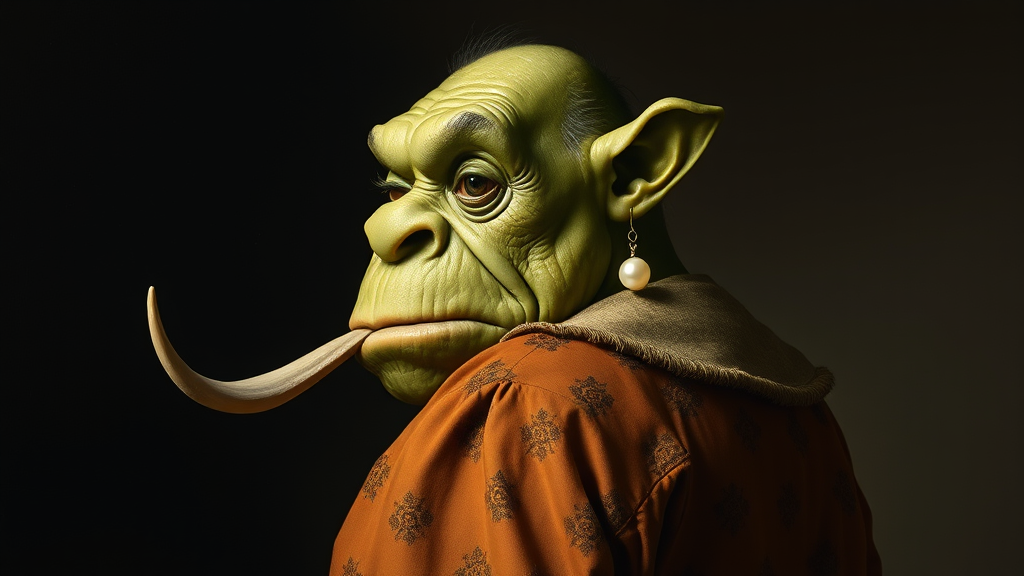 An ogre with gentle, moss-green skin, dressed in a soft, flowing fabric reminiscent of a classic Dutch outfit, turns its head gracefully against a dark, shadowed background. Its large, expressive eyes glint with a surprising gentleness, capturing a sense of wonder and curiosity. The light catches on its tusks, casting subtle highlights that interplay with the ochre and muted earthy tones of its garments. A polished pearl earring dangles elegantly from its oversized, pointed ear, capturing the soft light with a luminous glow. The blend of Vermeer's mastery of light and texture with whimsical charm breathes life into this unexpected subject, creating a harmonious juxtaposition that maintains the serene intimacy of the original masterpiece.