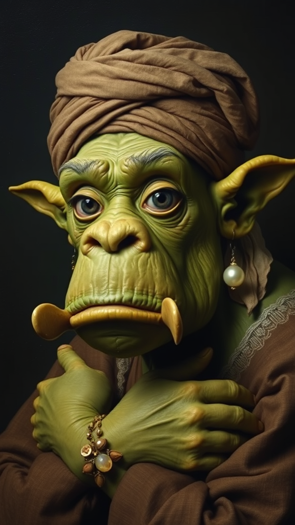 An ogre with green-tinted skin and prominent tusks poses against a dark, subdued background, their large, expressive eyes gazing thoughtfully at the viewer. They wear a simple headdress reminiscent of a turban, with earthy tones softly blending into each other. A delicate pearl earring dangles from one oversized ear, its luminous surface contrasting with the ogre's rugged appearance. The play of light and shadow highlights the ogre's features, creating a serene yet captivating ambiance that pays homage to Vermeer's classic style while introducing an enchanting twist.