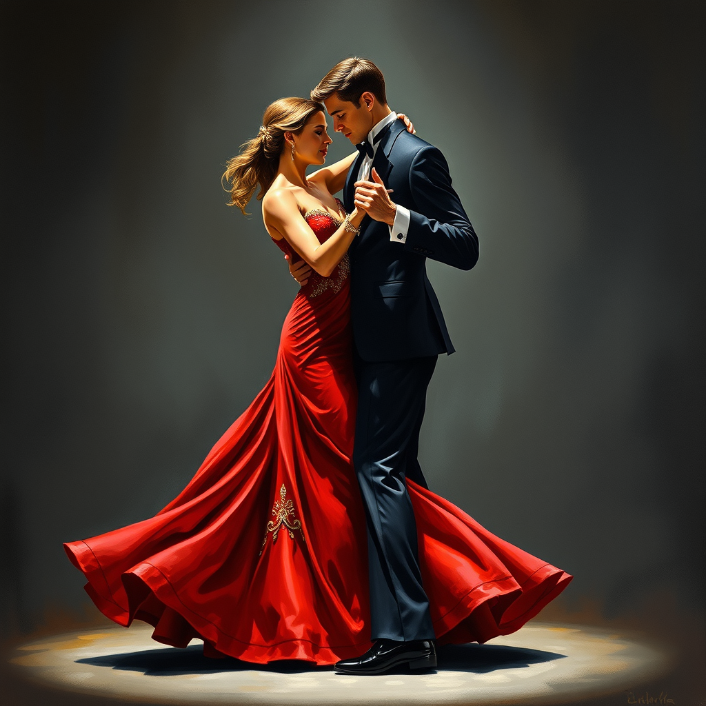 An oil painting depicting a man and woman passionately dancing the tango, both adorned in elegant formal attire. The woman dazzles in a flowing, crimson red gown adorned with subtle gold accents, while the man is sleek in a classic black tuxedo. They are immersed in an intricate dance, their bodies gracefully entwined, on a dimly lit stage. The background is a deep charcoal gray, adding an air of mystery and sophistication, with a hint of soft light casting delicate shadows that enhance the scene's drama and allure.