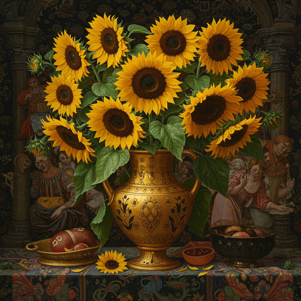 An oil painting depicting a plethora of sunflowers in a richly adorned golden vase, capturing the essence of 1000–1400 CE art style with intricate detailing and vibrant colorization reminiscent of Simon Prades. The composition is eye-catching and teeming with life, incorporating wimmelbilder elements where every inch of the canvas reveals a hidden narrative. The texture is intentionally grainy, evoking a sense of historical depth and authenticity. Set in an elongated aspect ratio of 35:46, the scene is stylized at a level of 750, merging classical elegance with a modern high-definition clarity of 32k UHD.